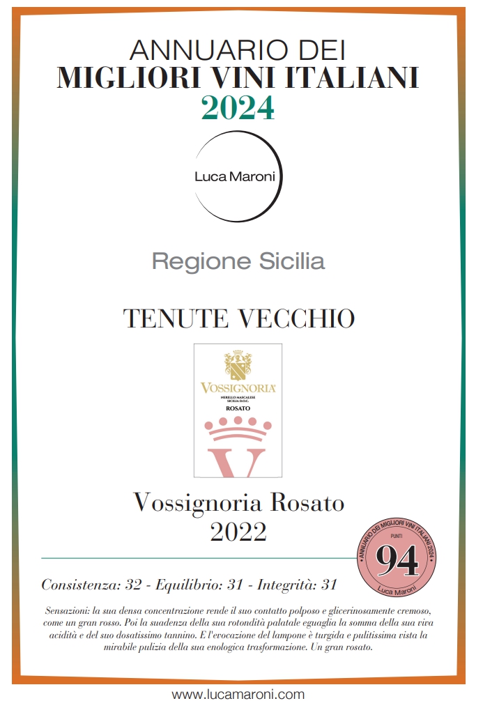 Il vino Vossignoria Rosato delle Tenute Vecchio nasce da vigneti alle pendici del Vulcano di Sicilia e nella Valle dell’Alcantara. È un vino la cui fragranza rievoca profumi e aromi della magica Terra di Sicilia, un prodotto ottenuto da uve pregiate con procedimento tradizionale. Di colore rosa cerasuolo cristallino. Morbido e armonico al palato, con finale fruttato e minerale.